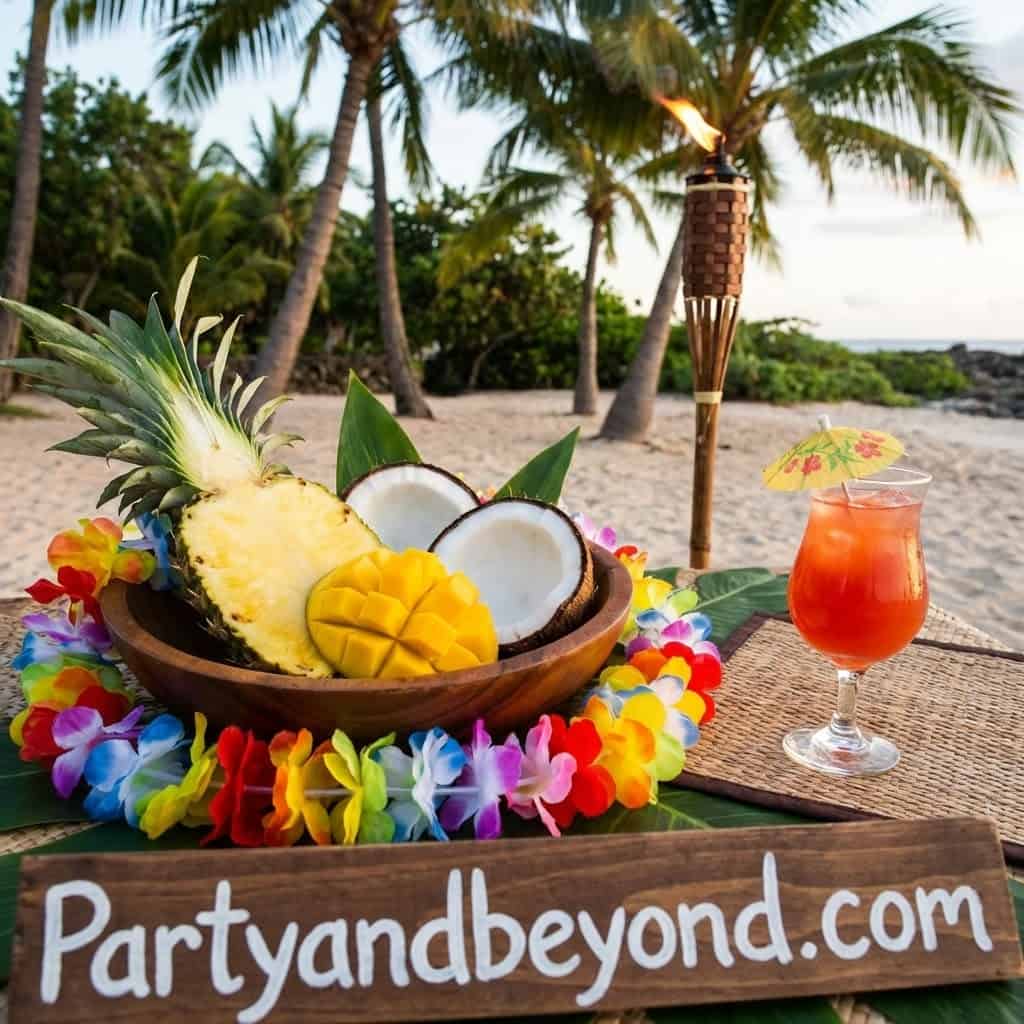 Serve tropical drinks, grilled pineapple, and skewers to match the theme. Background music with beach vibes instantly makes the space feel lively and fun.