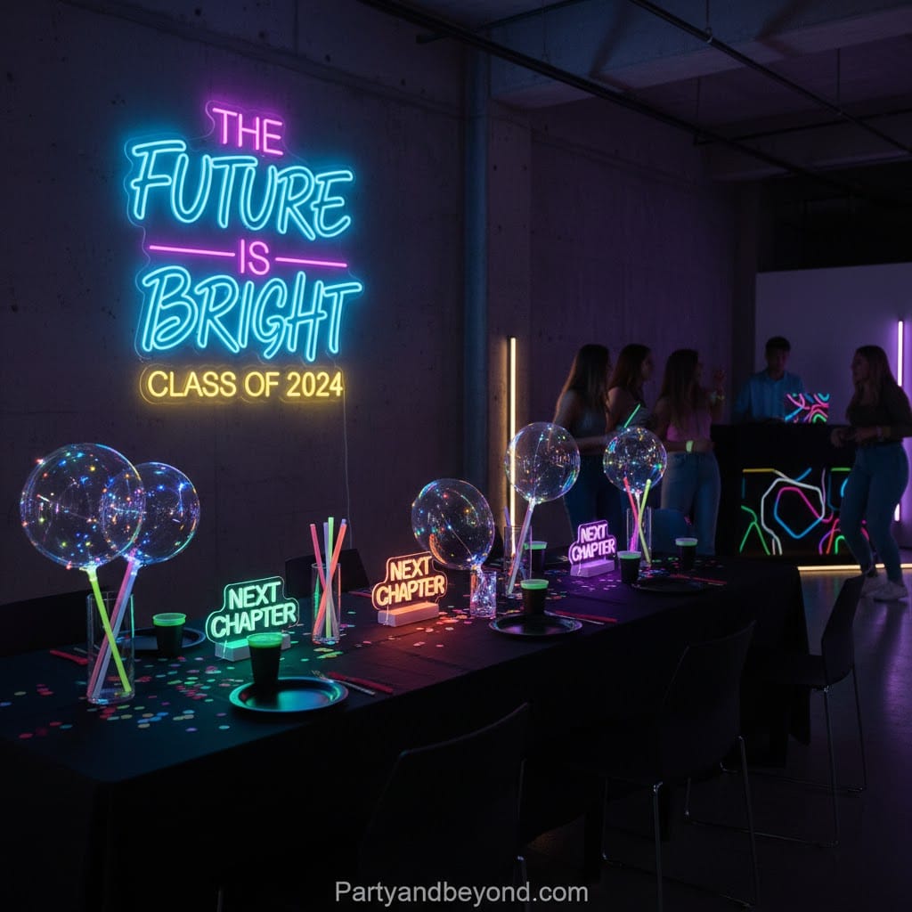 This theme plays with bold colors, neon signs, and glowing décor that literally lights up the night. It’s energetic, modern, and perfect for grads who love fun visuals.