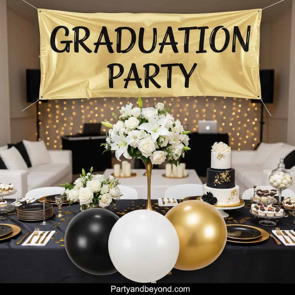 Black, white, and gold work because they scream achievement. From tableware to balloons, everything looks polished and photo-ready. Guests feel like they’re attending something important — because they are.