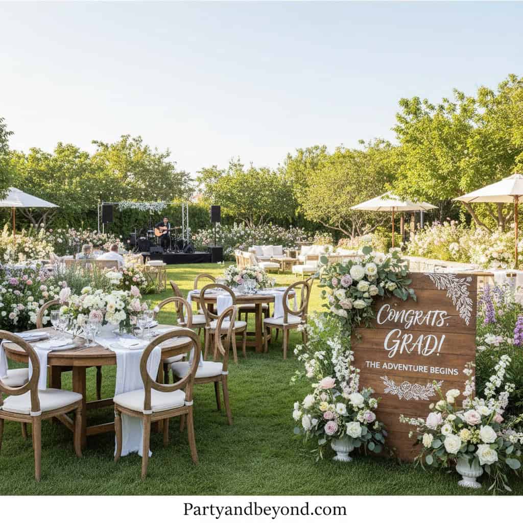Garden-style grad parties feel calm, elegant, and refreshing. Flowers, greenery, and natural textures create a peaceful celebration that still feels special.