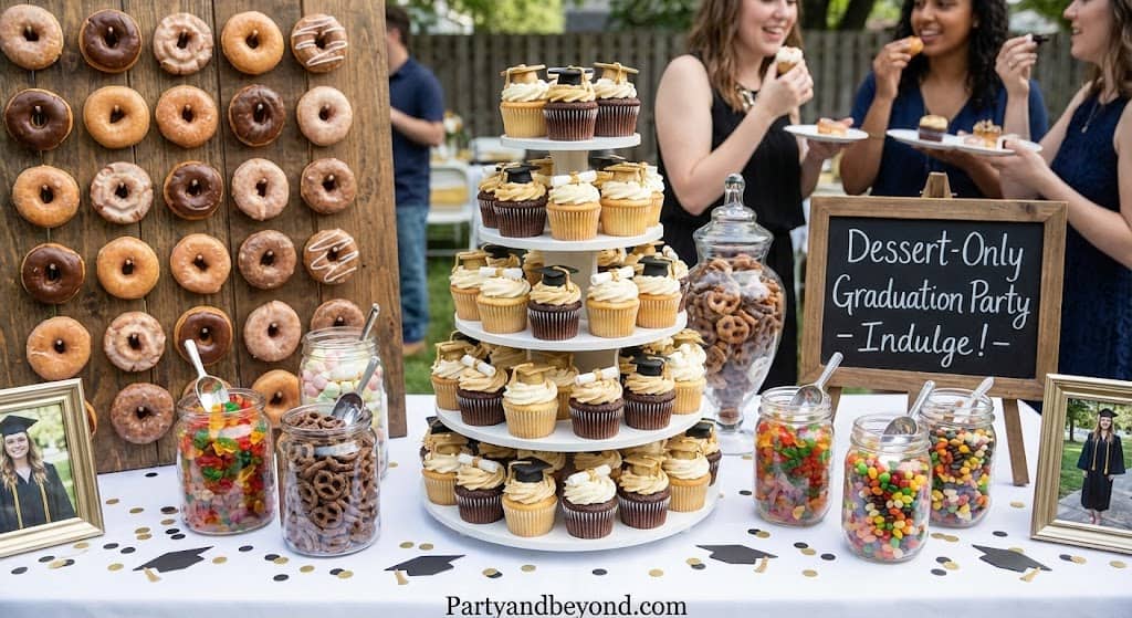 A dessert-focused grad party feels indulgent and fun without the stress of catering. It’s perfect for daytime or short celebrations.