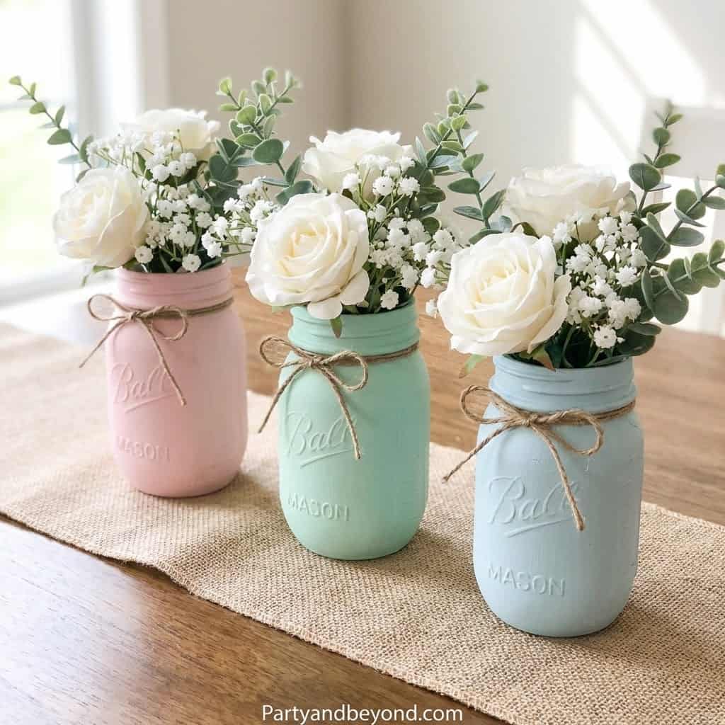 Fill mason jars with fresh flowers, add a few decorative eggs, and wrap them with pastel ribbons. Or create small nests with faux grass, placing mini chocolate eggs inside. These centerpieces double as décor and edible treats for guests.