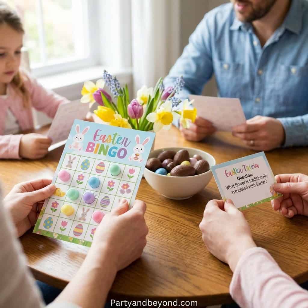 Games don’t always have to be physical. Easter bingo or trivia keeps the party lively while offering something for quieter guests.