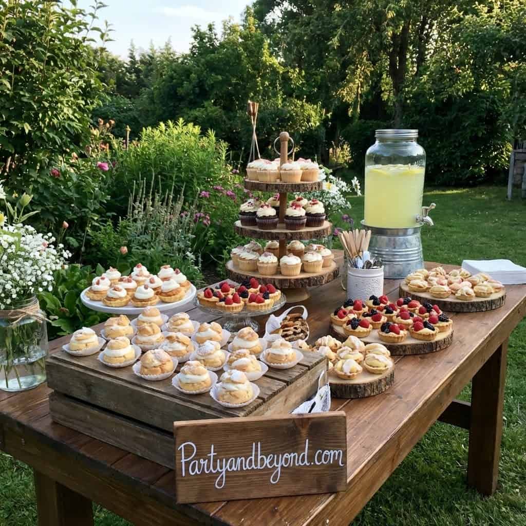 Create a styled outdoor dessert table with cakes, cupcakes, and sweets displayed at different heights. Use wooden stands, crates, or trays for visual interest.