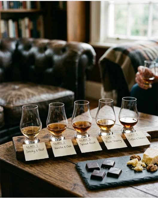 Turn a corner of the house — the den, the garage, a covered patio — into a temporary tasting lounge. Three to five whiskeys or craft beers, small tasting glasses, handwritten notes on each. A small plate of dark chocolate, aged cheese, or smoked nuts on the side. Good jazz, low lighting, zero kids in that zone. Let him lead the tasting if he wants to or let someone else run it if he’d rather sit back.