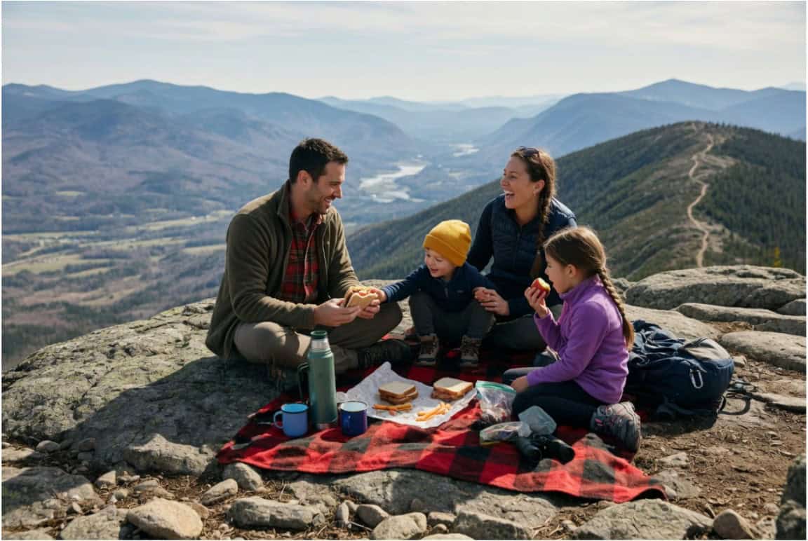 Pick a hike that’s under three hours round-trip and ends somewhere with a view. Pack a proper lunch in a backpack — sandwiches, fruit, cookies, a thermos of coffee or cold drinks. Eat at the top. Take one good photo. Walk back. This is a low-effort, high-reward plan for dads who like feeling like they did something without needing it to become a whole production.