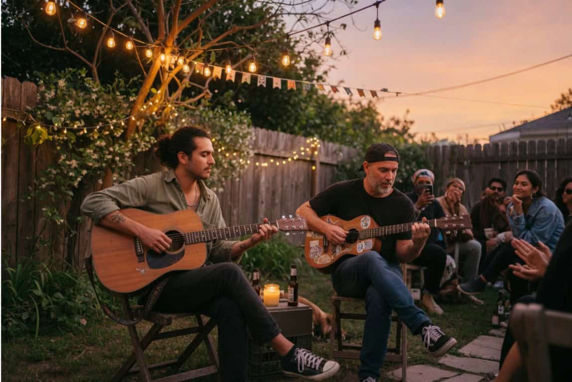 If he plays an instrument, or if any of his friends do, this is the day. Set up an outdoor corner with a couple of chairs, a guitar, maybe a cajón or harmonica. Let the music happen naturally. Acoustic is best for this — unplugged, loose, nothing rehearsed. If nobody plays, hire a local acoustic musician for two hours. Background music turns a party into a vibe.