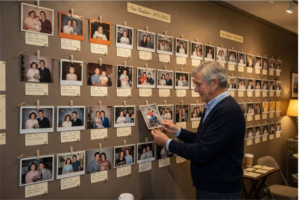 Instead of a random collage, organize photos chronologically from his childhood through today. Tape them to a wall or hang them on twine in order — baby photos on the left, current photos on the right. Add small index cards under each one with year and a one-line caption. Guests will stop and walk the timeline like a small museum exhibit. The sentimental dad will spend 30 minutes in front of it, quietly.
