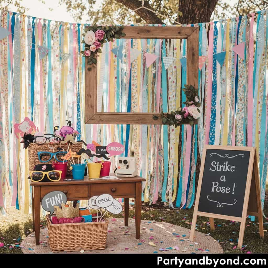 Hang a simple backdrop using curtains, balloons, or streamers. Add fun props like hats or birthday signs.