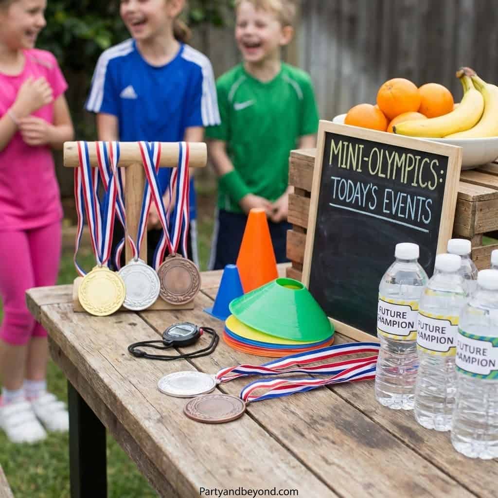 A mini-Olympics setup with relay races, obstacle courses, and jumping contests keeps kids moving nonstop.