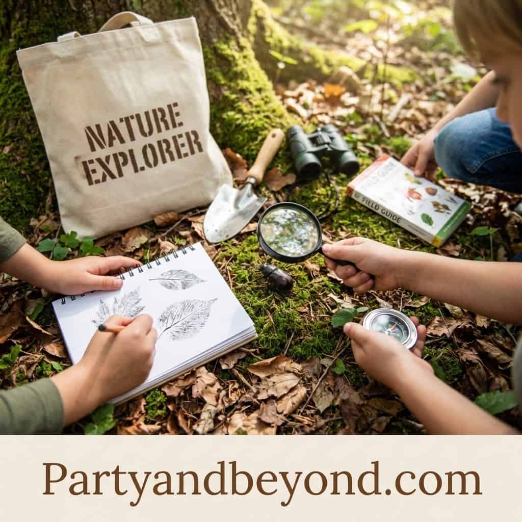 A nature explorer party invites kids to investigate the outdoors with magnifying glasses, bug charts, and leaf collection sheets.