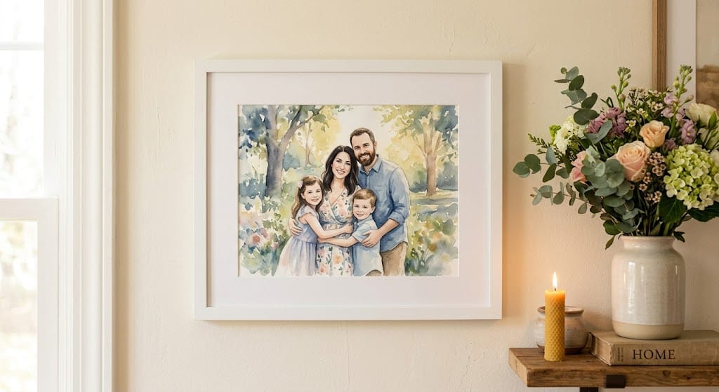 Platforms like Etsy are absolutely full of talented artists who specialize in custom family portraits in every possible style: watercolor, minimalist line art, whimsical cartoon, detailed digital illustration, and classic oil-painting style reproductions. Prices range from twenty-five dollars for a simple digital download you can print yourself to a few hundred dollars for a large, framed original. For most budgets, a beautiful mid-range custom portrait runs between fifty and one hundred dollars and arrives ready to frame.