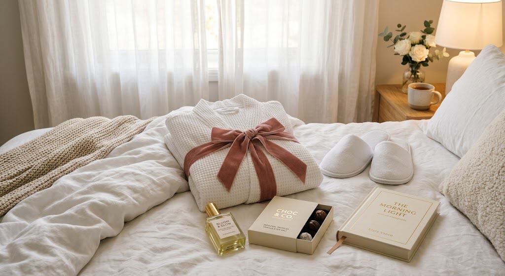 Create a small self-care set to accompany it: a high-quality body lotion or oil in a scent you know she loves, a pair of cozy slippers, a good book or a magazine, and a small box of her favorite tea or chocolates. Fold everything together inside the robe and present it tied with a wide silk ribbon. The visual presentation of this gift — a rolled, ribbon-tied bundle of softness — is as beautiful as the gift itself, and it communicates very clearly: today is for you, and you deserve to feel wonderful.