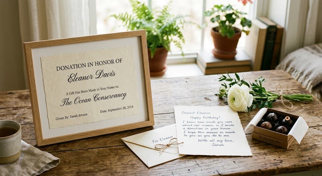 This gift works only when it is genuinely tailored to her specific values and chosen with real attention. Pay attention to what causes she discusses with passion — animal welfare, a particular environmental organization, a local food bank she volunteers at, a medical research foundation connected to something her family has experienced, a scholarship fund for young women, a literacy program she has mentioned. Make the donation, obtain a certificate or confirmation, and present it in a card that explains: “I made this gift because I wanted to give in a way that reflects the kind of person you are and the world you are working to build.”