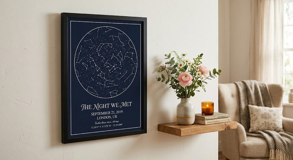 Frame it yourself in a simple black or white frame from a home goods store. Write a card that explains exactly which night you chose and why — the meaning you have attached to it. Pair the star map with that explanation and you have a gift that will hang on her wall for decades and mean more with every passing year.