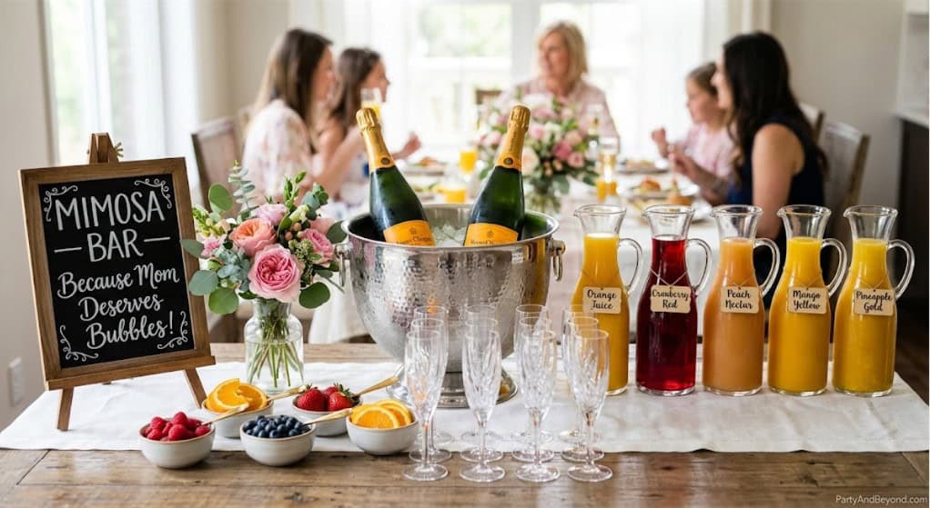 For non-drinkers, provide sparkling water or ginger ale as a champagne substitute. Label it “Mama Mocktail” and serve it in the same glasses so everyone participates equally. A hand-lettered sign reading “Mimosa Bar — Because Mom Deserves Bubbles” completes the station.