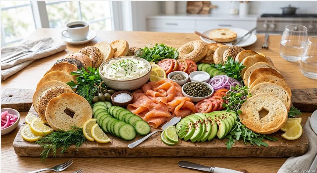 A bagel board is the brunch equivalent of a charcuterie board — a large, beautiful spread arranged on a single board where guests graze and build their own bagel combinations. It is visually impressive, requires zero cooking, and feeds a crowd effortlessly.