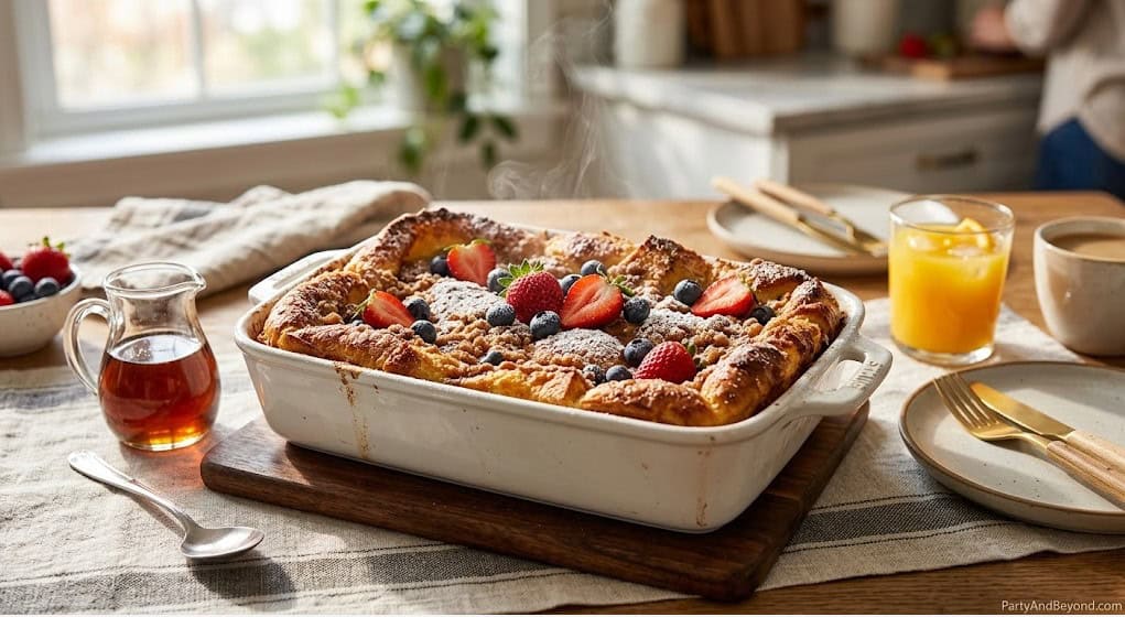 Serve it straight from the baking dish with a pitcher of warm maple syrup, a bowl of fresh berries, and a dusting of powdered sugar. This single dish feeds eight to ten people generously and costs about $8 to $10 in ingredients. It is the foundation of a Mothers Day brunch that feels effortless but tastes extraordinary.