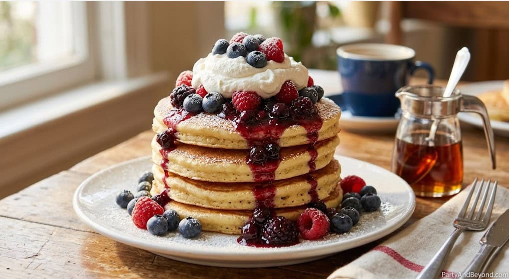 Stack three to four pancakes per plate, spoon the warm berry compote over the top, add a dollop of whipped cream, and finish with a few fresh berries and a light dusting of powdered sugar. Place a small pitcher of maple syrup on the table for traditionalists who want both. The visual impact of the purple-red compote cascading down a golden pancake stack is genuinely stunning and photographs beautifully for the inevitable Mothers Day Instagram post.