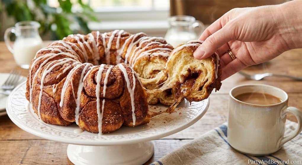 Take a tube of refrigerated cinnamon rolls ($3 to $4), cut each roll into quarters, toss the pieces in melted butter, cinnamon, and brown sugar, pile them into a greased bundt pan, and bake at 350 degrees for 25 to 30 minutes. Flip the pan onto a plate and drizzle the included icing over the golden, caramelized top. The result is a dramatic pull-apart bread that looks like it took hours but took ten minutes of hands-on time. Guests pull apart warm, gooey, cinnamon-sugar pieces with their fingers — no cutting required, no serving utensils needed, just pure sticky-fingered happiness.