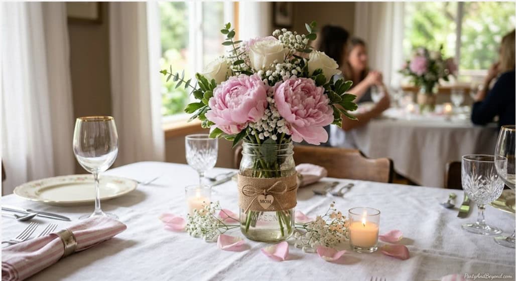 A single mason jar filled with fresh flowers from the grocery store creates a centerpiece that is simple, beautiful, and costs under $5. Choose flowers in her favorite colors — or default to soft pinks and whites for a classic Mothers Day palette. Wrap the mason jar in a piece of burlap ribbon or a strip of lace for a farmhouse-chic look, or leave it bare for modern simplicity. Place it in the center of the table surrounded by a few scattered flower petals and two small votive candles. This minimalist centerpiece proves that elegance does not require extravagance.