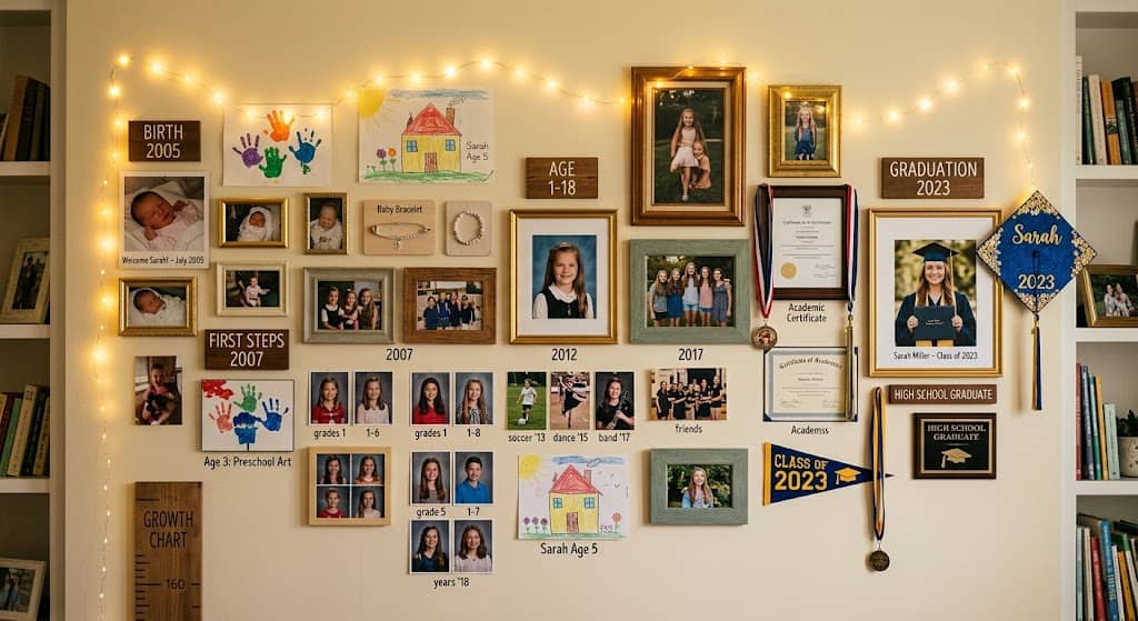 Label each section by year or phase of life. Guests will spend ages walking through it, pointing at photos, and sharing memories. It becomes a natural conversation starter and a deeply emotional tribute to the graduate’s journey.