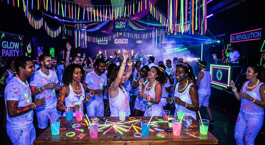 Get black lights, neon decorations, glow sticks, and UV-reactive body paint. Guests can wear white shirts and paint each other throughout the night. The result? An incredibly fun, photo-worthy event that nobody will forget.