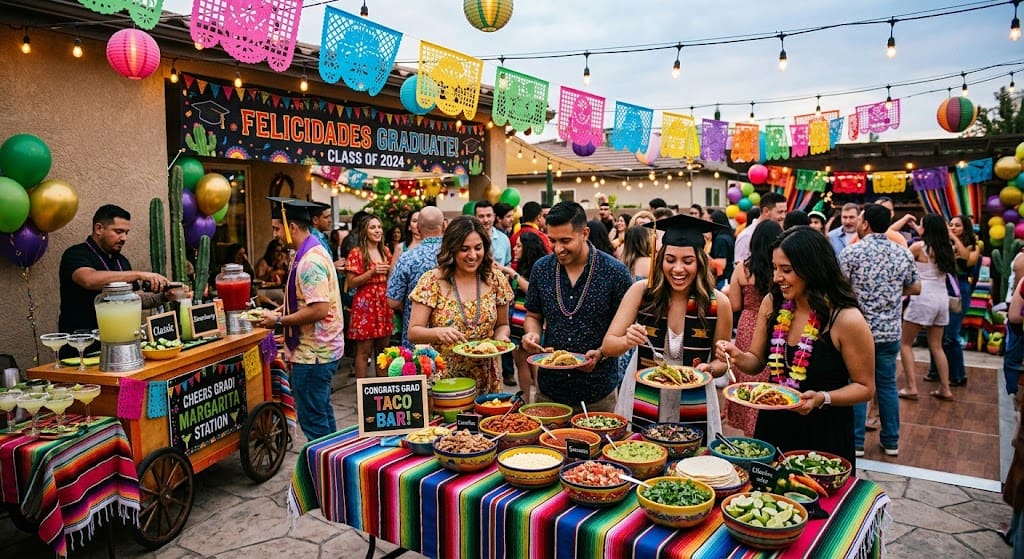 A taco bar is one of the most universally beloved graduation party food setups — and turning it into a full fiesta theme makes it an event in itself. Colorful papel picado banners, sombreros as photo props, bright tablecloths, and a margarita (or agua fresca) bar complete the look.
