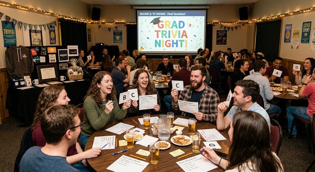 You can also mix in general knowledge rounds about the grad’s major, hometown, or future career plans to keep things relevant and celebratory.