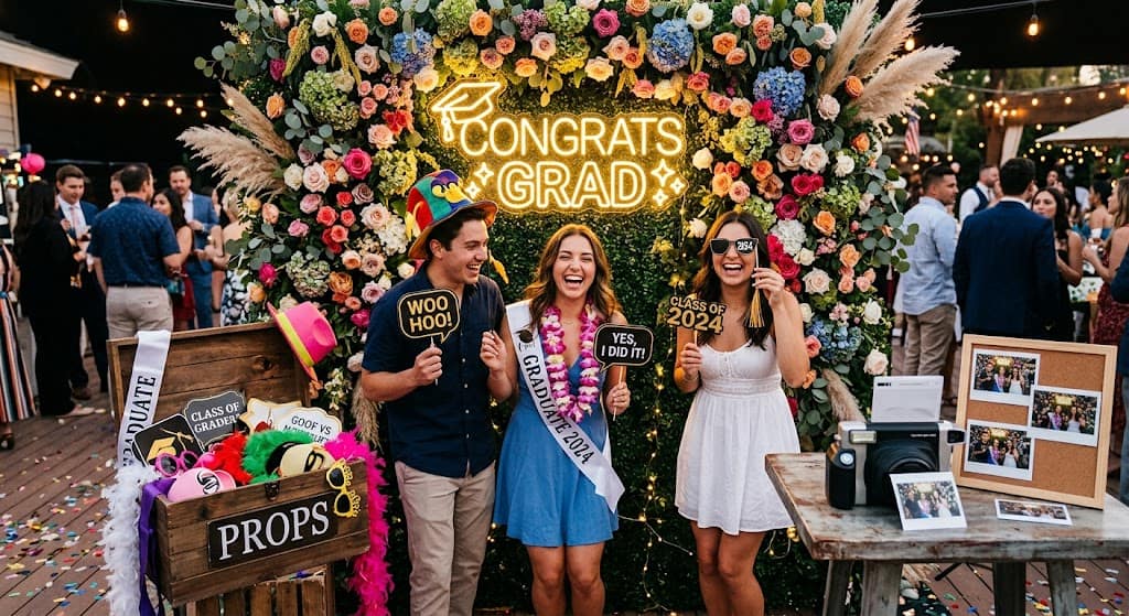 Create a custom backdrop using streamers, florals, or a neon sign with the graduate’s name. Stock a prop box with oversized glasses, graduation caps, diplomas, and funny signs. Set up a ring light on a tripod and let guests go wild.