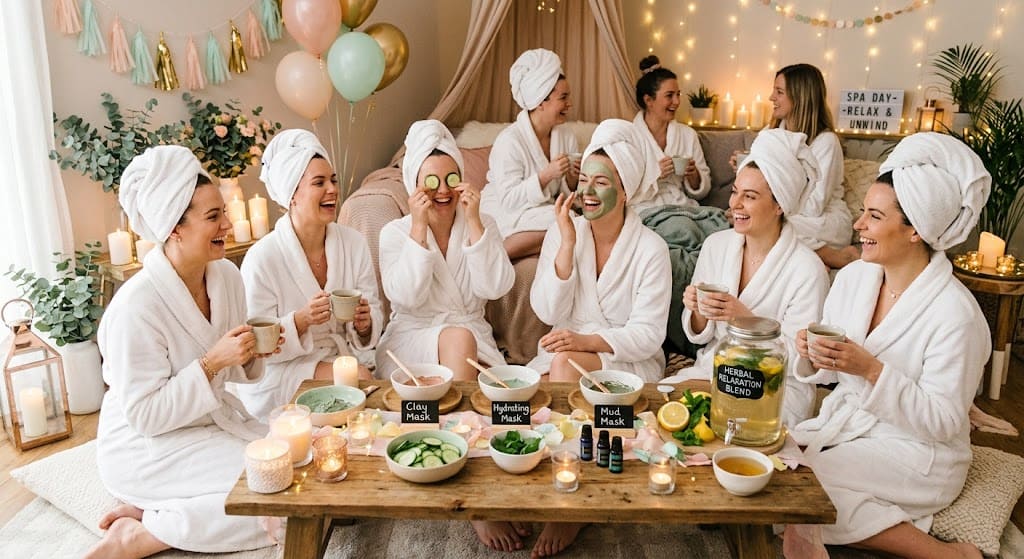 Set up DIY stations for face masks, nail painting, and hand scrubs. Offer herbal tea, sparkling water with cucumber and mint, and light, healthy snacks. Play soft ambient music and use candles (safely!) and essential oil diffusers to set the mood.