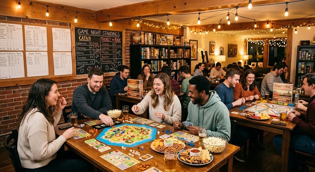 Set up stations throughout the space — one table for a strategy game like Catan, another for a fast-paced party game like Codenames, and a central area for group games like Jackbox (if you have a TV and smart devices).