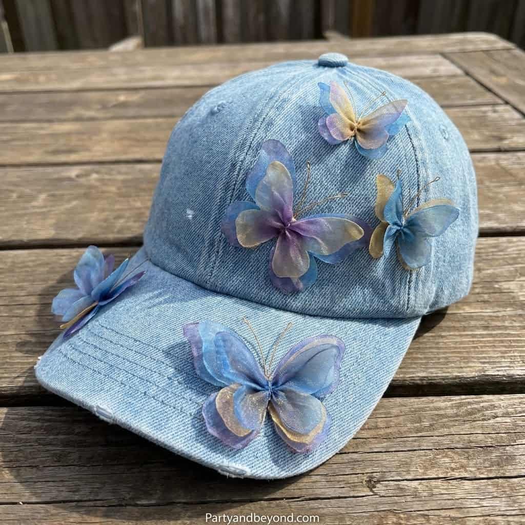 Attach 3D butterfly cutouts so they appear to be flying off your cap.