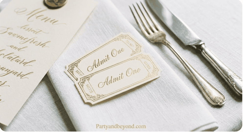 Do you need real tickets? You don’t, but they add instant storybook charm. Hand guests a few printed “play passes” at check-in, or drop them at place settings so everyone starts with the same invitation to join. What if you don’t want anything that looks like a kids’ party? Choose one neutral base—cream, black, kraft, or blush—and add one bold accent color that matches your florals. Even a simple custom token system can look luxe when it matches the tablescape.