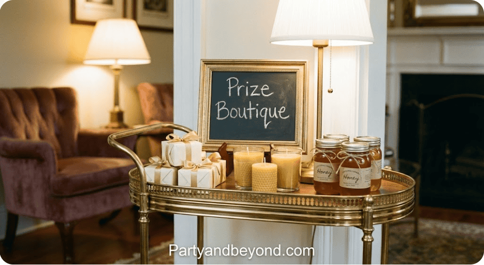 How do prizes stay classy? Curate a small “prize boutique” instead of a pile. Display items on a vintage suitcase stack, a velvet-covered tray table, or a gold shelving cart so it looks like part of your design.