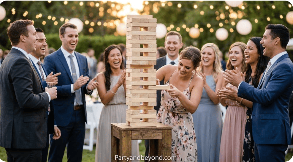How do you keep it on theme? Write quick prompts on a handful of blocks: “Tell the couple your best advice,” “Trade a compliment with the person next to you,” “Do your best circus bow.” Guests answer immediately, laugh, and keep stacking. Worried it’ll get too intense? Set a “one-hand rule,” cap the crowd at six players per round, and place it on a flat mat so the blocks don’t slide. You’ll keep the drama fun without turning it into chaos.