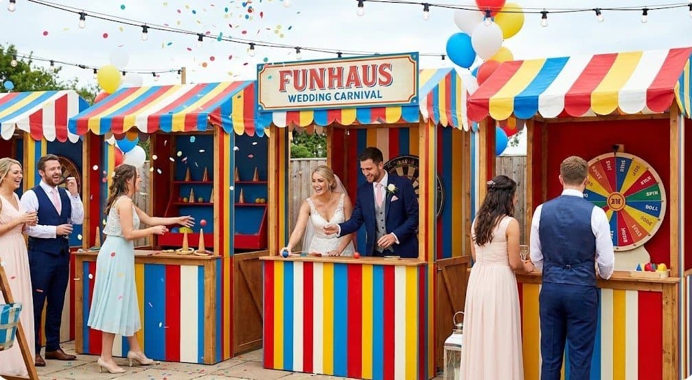 A FunHaus-inspired carnival theme takes that idea and turns the dial up. You’re not tossing in a random activity “just because.” You’re building a mini midway of carnival games that matches your décor, your playlist, and your personality. Do guests really want to play games at a wedding? Yes—when you make the interactive wedding entertainment easy to join, quick to understand, and cute enough to photograph, they jump in without you having to beg.
