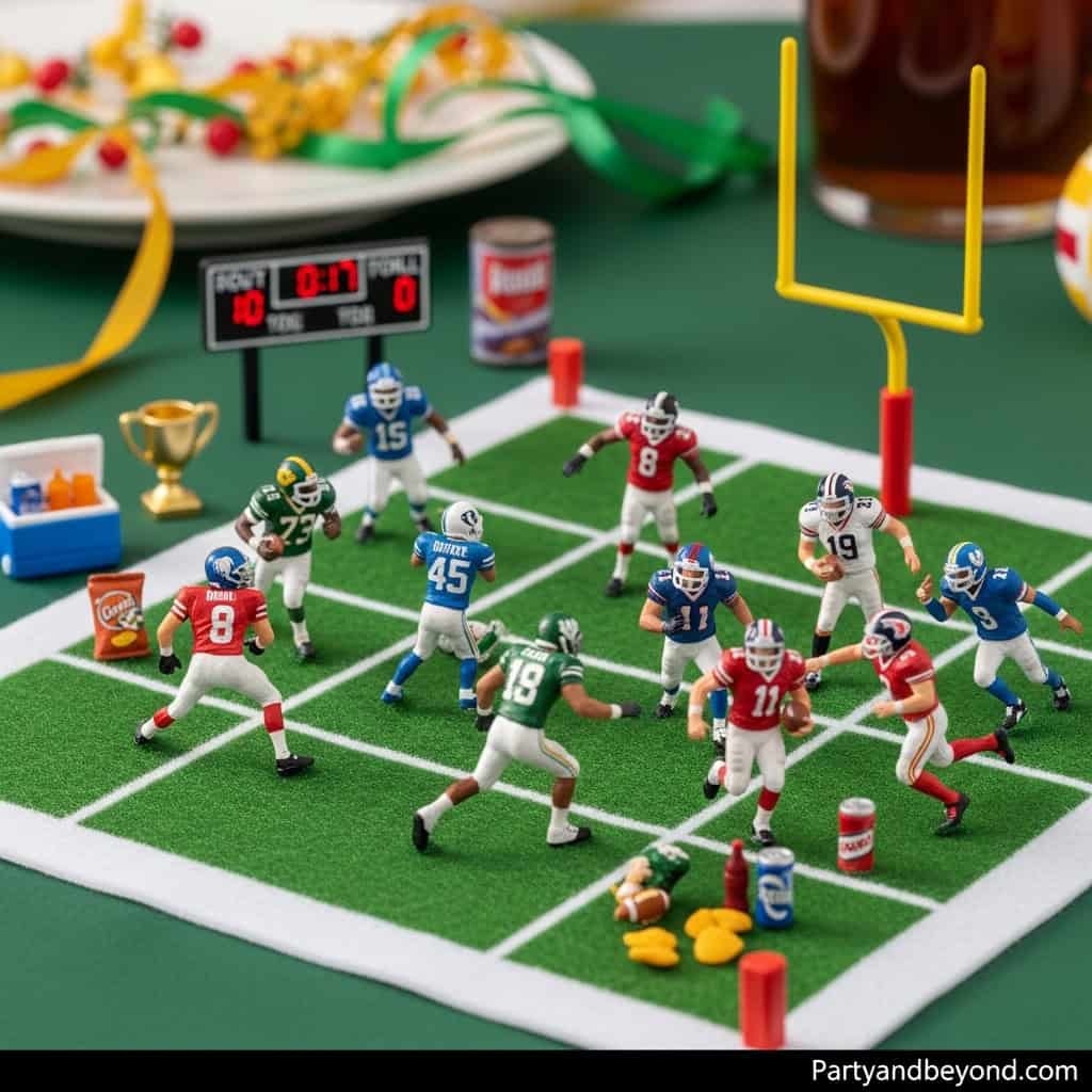 The Football Field Table Setup is one of the best ways to start your 21 Game-Day Décor & Interactive Activities for a Super Bowl Bash with strong visual impact. Transform your snack table into a mini football stadium by using a green tablecloth to represent the football field. Then use white tape to create yard lines, end zones, and midfield markings just like a real football ground.