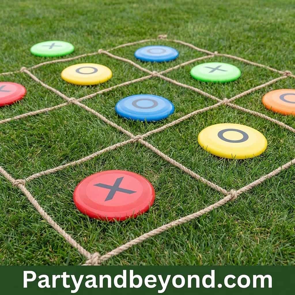 A throwing challenge with a strategy twist keeps everyone engaged. Draw a tic-tac-toe grid on the lawn and have players toss frisbees to land in the squares.