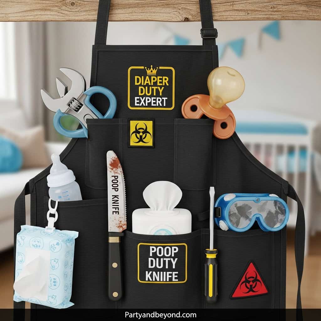 A diaper duty apron loaded with pockets for wipes, diapers, a face mask and tongs turns changing diapers into a hilarious experience. It’s practical and makes a great conversation starter.