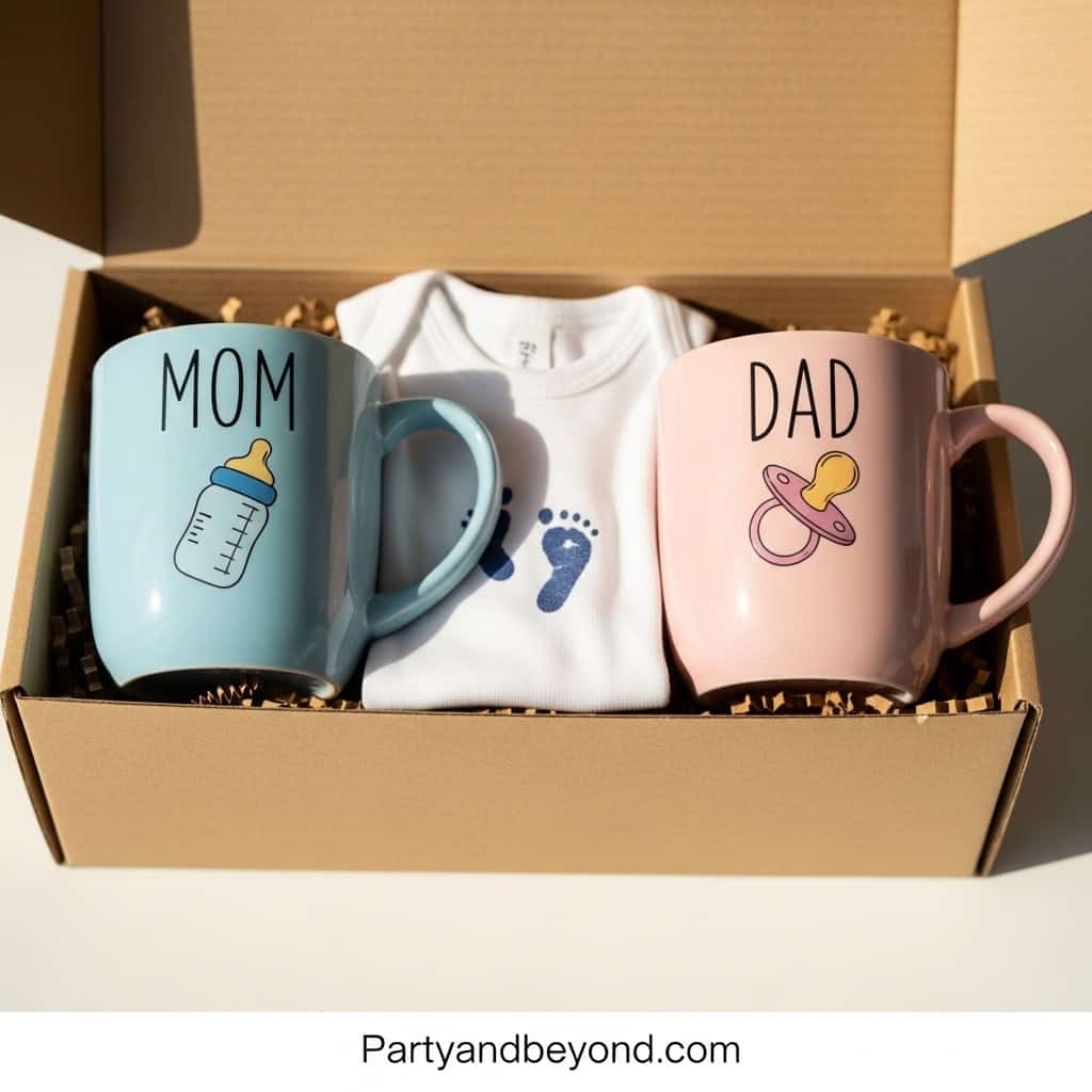 Gift boxes with matching mugs (e.g., “Mom” and “Dad”) and a neutral onesie show that you care about both parents and the baby. They’re thoughtful and practical.