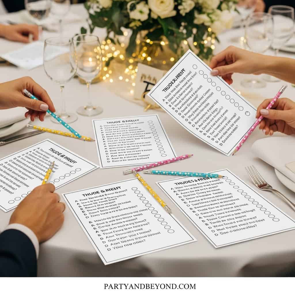 Once everyone has completed their Mad Libs, gather the cards and read them out loud for a good laugh. This game is a fantastic icebreaker, encouraging guests to get creative and share their humor with others. It’s also a great way to include personal touches and inside jokes, making the game even more special and memorable.