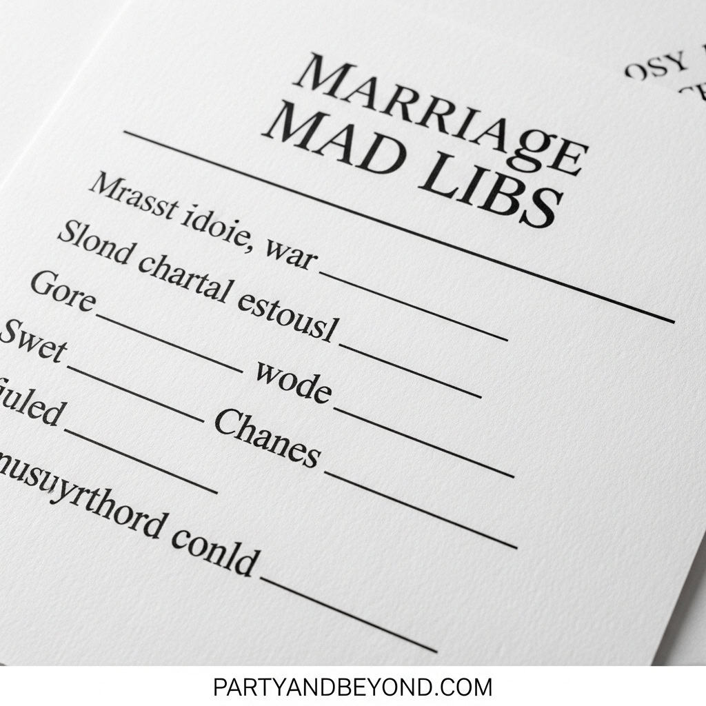 Marriage Mad Libs is a humorous and interactive game that adds a lighthearted touch to your wedding. Create fill-in-the-blank cards with funny prompts about marriage and relationships, and distribute them to your guests. They can fill in the blanks with random nouns, adjectives, and verbs, resulting in hilarious and often unexpected stories.